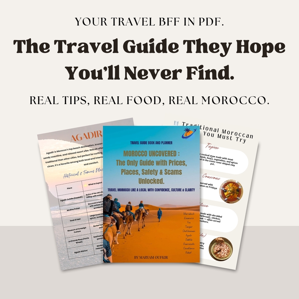 Morocco Uncovered: The Only Guide with Prices, Places, Safety & Scams Unlocked This all-in-one digital travel guide helps you explore Morocco like a local. Inside, you’ll find handpicked places to stay, eat, and explore in 10+ iconic cities—from Marrakech to Chefchaouen to Dakhla. Get real price ranges, insider tips on traditional foods, essential Darija (Moroccan Arabic) phrases, safety advice for women, what to wear, and smart ways to avoid common tourist scams. Plus, enjoy printable planners to map out your dream trip — stress-free. Written by a Moroccan woman, this guide is raw, honest, and deeply local.